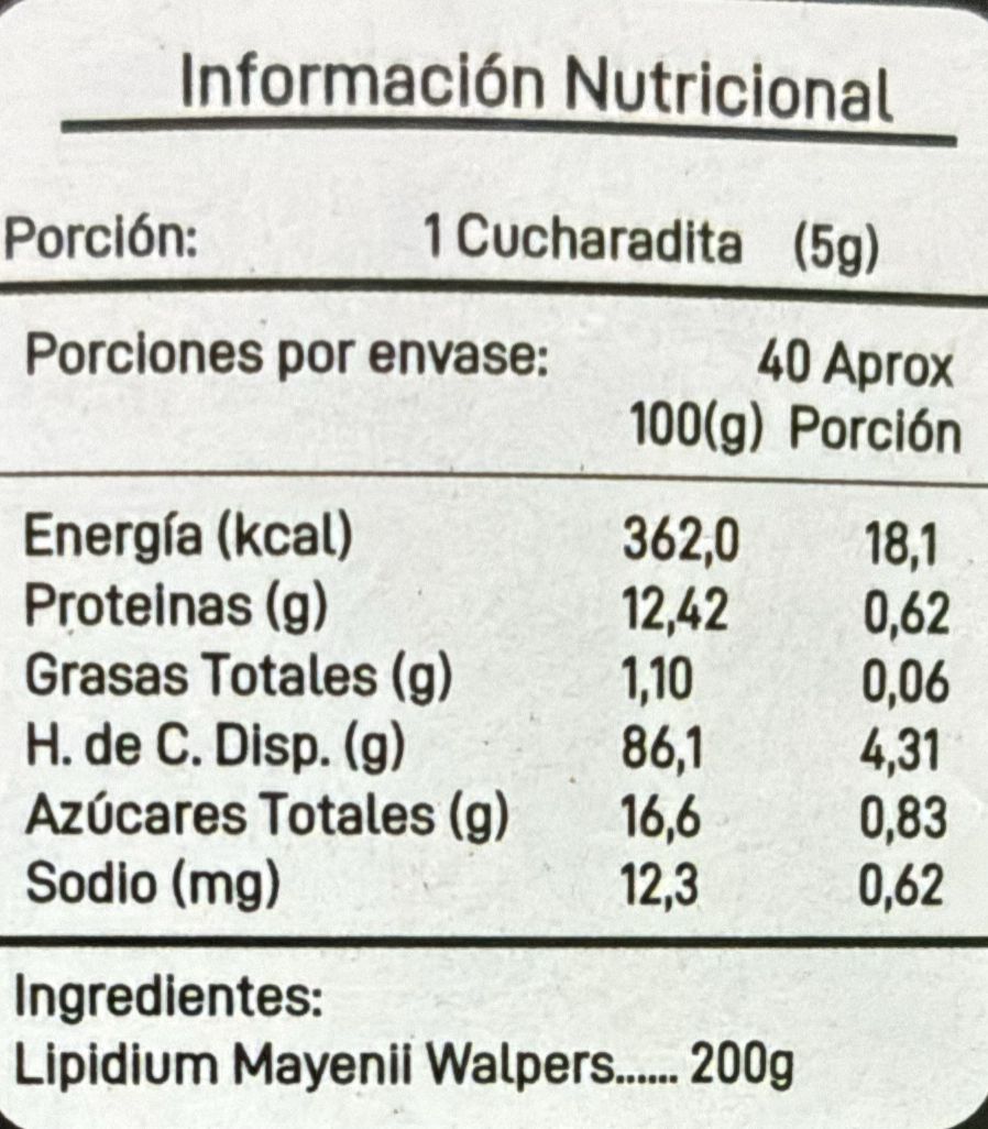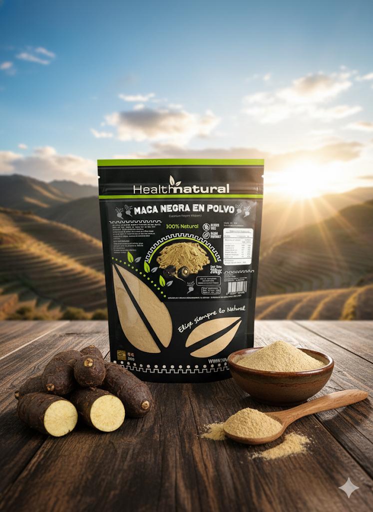 PROPIEDADES: La maca negra es un energizante natural, ayuda a la resistencia física y mental. Al ser un alimento afrodisiaco ayuda a la fertilidad masculina y a la libido, previene la osteoporosis y sirve para personas con diabetes ya que ayuda a controlar la glucosa. Es rena fuente rica en vitaminas B1, B, E, C , y en minerales como el hierro, calcio, magnesio, fosforo, potasio y zinc.